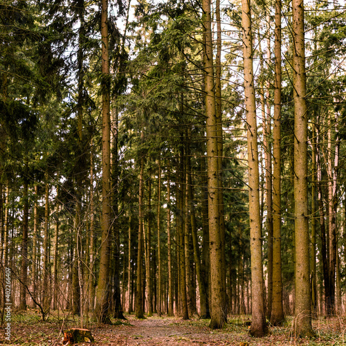 Fototapeta premium spruce forest, pinery, pine forest, Pine Tree, Fairy Forest, untouched spruce forest
