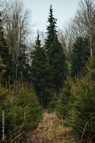 © evgavrilov, Fototapeta premium spruce nursery. reforestation after logging. agriculture with concern for the environment. young Christmas trees grow on the plot