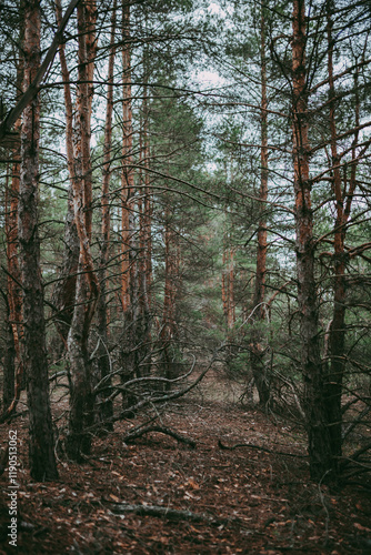 Fototapeta premium Spruce pine forest in a dark key