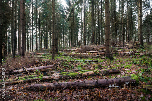 © JGade, Obraz premium Spruce tree forest with lots of tree trunks laying spread on the forest floor after being cut down