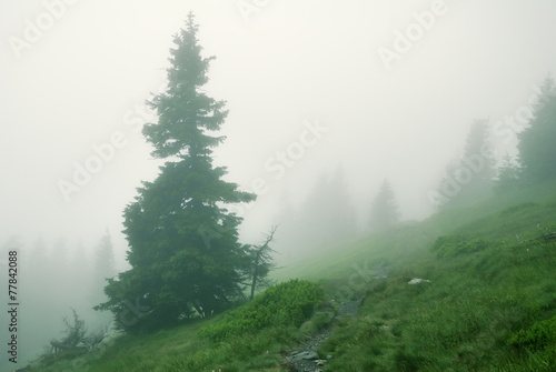 © grondetphoto, Fototapeta premium Spruce tree in dense fog in the mountains