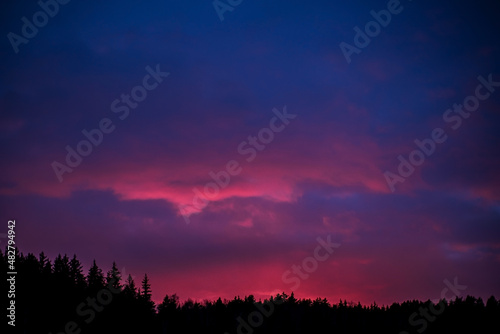 © Maksim Shebeko, Obraz premium Spruce tree silhouettes in the warm glow of sunset.