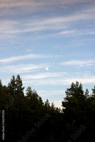 Fototapeta premium Spruce trees and sky with clouds on sunset for background. Place for text.