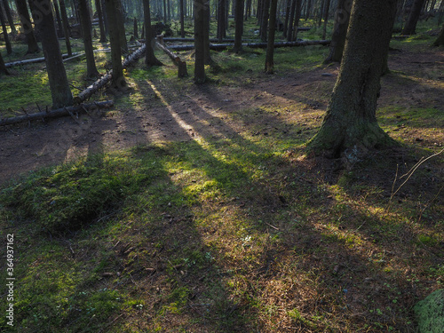 © enskanto, Obraz premium spruce trees in the forest at sunset