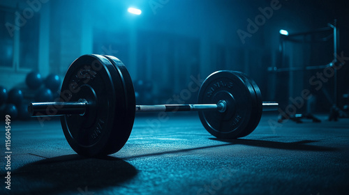 Naklejka premium Sprzęt do treningu siłowego, w tym sztanga i obciążenia, leży na podłodze siłowni w przyciemnionym oświetleniu.