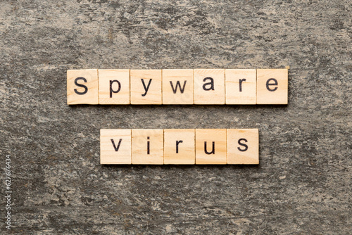 Fototapeta premium Spyware virus word written on wood block. Spyware virus text on cement table for your desing, concept