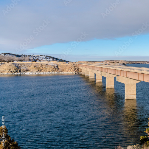 Obraz premium Square Bridge over lake connecting hills covered with snow on a sunny winter day