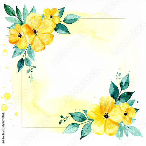 © hardvicore, Obraz premium Square floral watercolor frame in light yellow pastels, subtle paint splatters. Botany design.