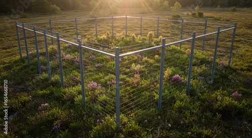 © awik, Fototapeta premium Square Metal Fence Enclosing Wildflowers at Sunrise