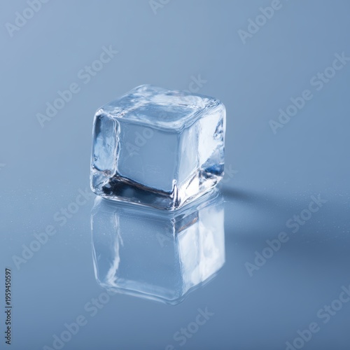 Obraz premium Square transparent ice cube on wet reflective surface, sharp edges, subtle...