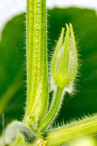 Fototapeta premium Squash blossoms and fruits growing in a greenhouse