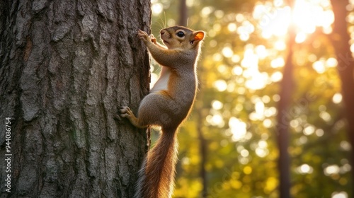 © almeera, Obraz premium Squirrel Climbing a Tree in Sunlight