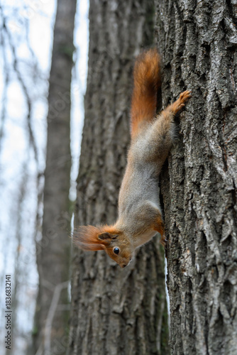 © Evgeniy, Obraz premium Squirrel climbing down a tree in a serene forest during early spring