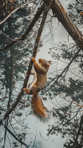 Fototapeta premium Squirrel climbing tree branch in forest, nature observation concept