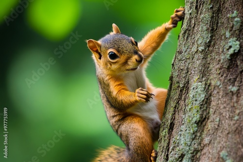© Sanchai, Fototapeta premium Squirrel climbing up a tree trunk with incredible speed, pausing to look back