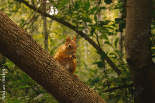 Fototapeta premium Squirrel eating a nut in green summer forest