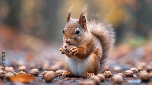 Fototapeta premium Squirrel eating a walnut in a forest, cute squirrel