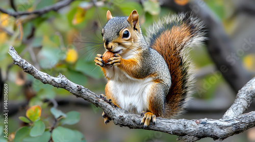 © suwatthana, Obraz premium Squirrel Eating Nut on Tree Branch in Nature Setting