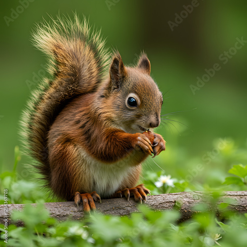© MdMasud, Fototapeta premium Squirrel Eating Nuts on Log in Forest