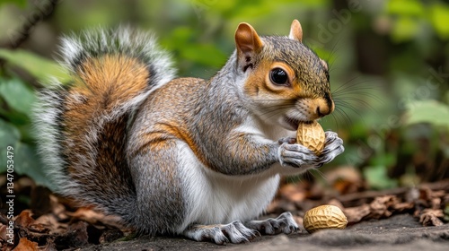 Fototapeta premium Squirrel eating peanut, forest floor, autumn leaves