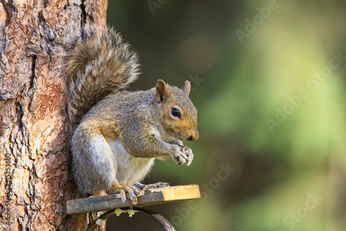 © Gregory Johnston, Fototapeta premium Squirrel eating seeds on a small platform.