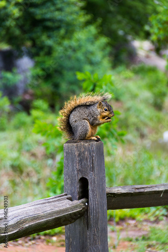 Obraz premium Squirrel Eats Nut on Fence post 2