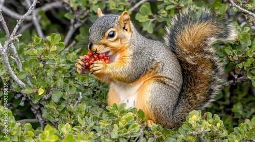 Naklejka premium Squirrel Eats Red Berries on a Bush