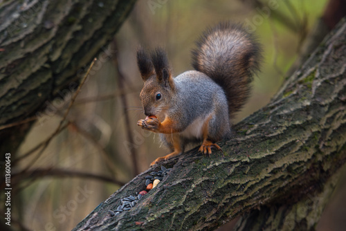 © Igor Kovalchuk, Obraz premium Squirrel feeding at branch