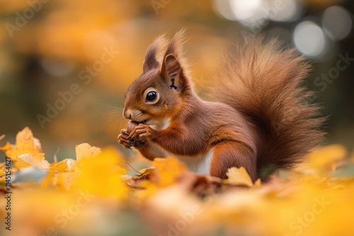 © Mia , Obraz premium Squirrel forages in a vibrant autumn landscape with fallen leaves