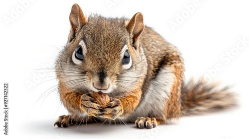 © tanongsak, Obraz premium Squirrel holding a nut, isolated on white background, full-body shot, colored background, cute and curious