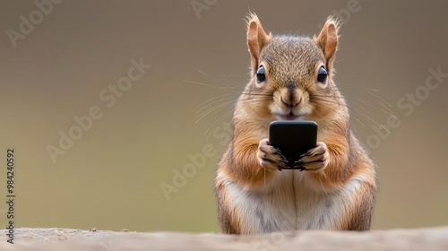 © 1000lnw, Obraz premium Squirrel holding smartphone, brown fur, white isolate background