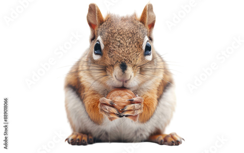© FMSTUDIO, Fototapeta premium Squirrel holds nut, looks at camera on white background