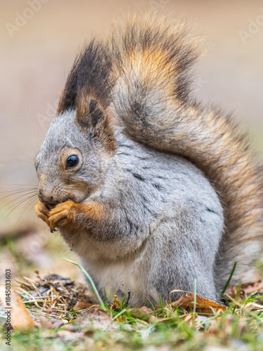 © Dmitrii Potashkin, Obraz premium Squirrel in autumn or spring with nut on the green grass with fallen yellow leaves