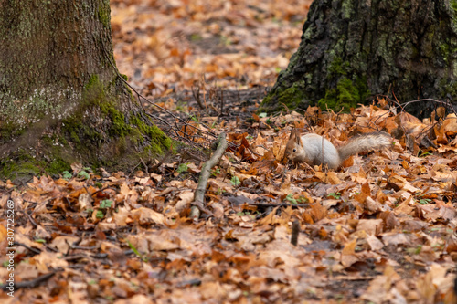 Obraz premium Squirrel in the autumn forest among the fallen leaves