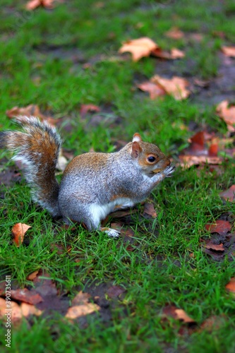 Fototapeta premium Squirrel in the park surrounded by green grass