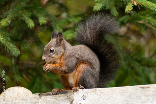 © Robert, Fototapeta premium Squirrel is sitting on a bench and eats a nut in a forest in Arosa in Switzerland