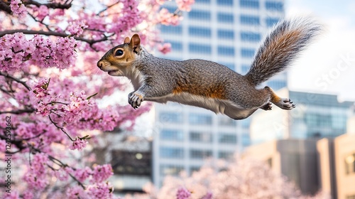 © Windi, Obraz premium Squirrel leaps cherry blossoms, city backdrop, spring