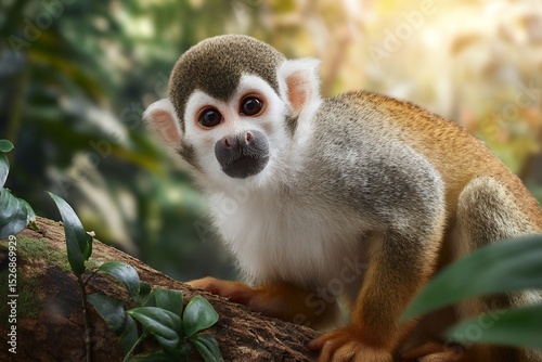 © Aleksandr, Obraz premium Squirrel monkey in lush jungle setting with sunlit background