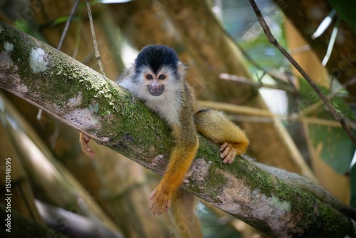 Obraz premium Squirrel monkey on a mossy tree branch.
