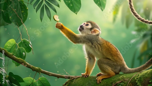 © Thanawat_Suesoypan, Obraz premium Squirrel monkey reaching for a slice of cucumber in the jungle