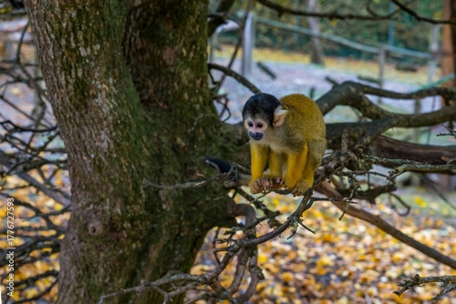 © Olga, Fototapeta premium Squirrel Monkey Sitting on Tree Branch in Autumn Forest