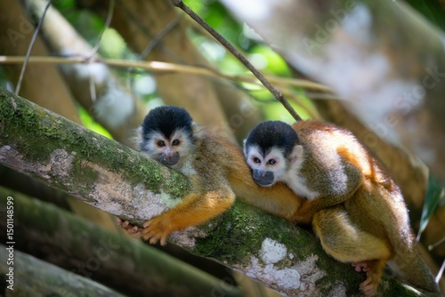 Obraz premium Squirrel Monkeys Resting on a Tree Branch