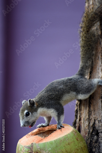 Obraz premium squirrel on a coconut, seen in the Lumphini Park, Bangkok, Thailand