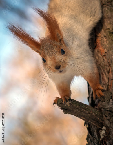 © Lumppini, Obraz premium squirrel on a pine tree. wild animals. endangered species.