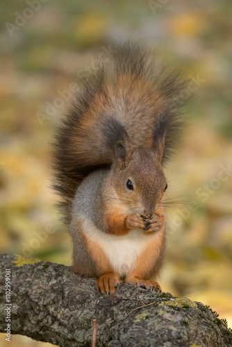 Fototapeta premium squirrel on a tree eats a nut closeup