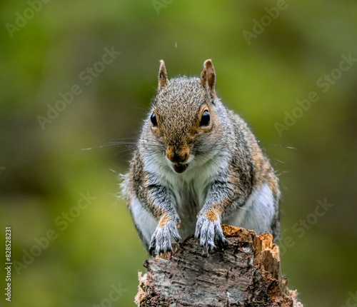 © Wirestock, Obraz premium Squirrel on a tree stump making eye contact with the camera