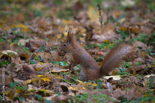 Fototapeta premium Squirrel on the ground with nuts in teeth.