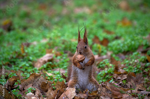 Fototapeta premium Squirrel on the ground with nuts in teeth.