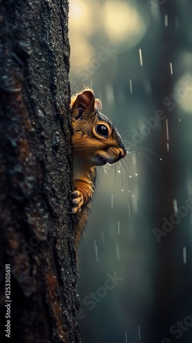 © Coffee Cafe Lover, Fototapeta premium Squirrel Peeking from Tree Bark in Rainy Forest Setting