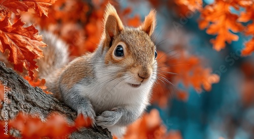 Fototapeta premium Squirrel Perched on Branch Amidst Autumn Leaves, Symbolizing Wildlife...